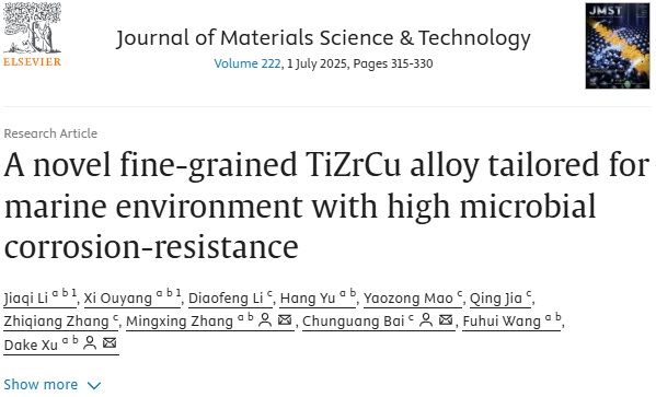 为应对这一挑战,东北大学徐大可教授和联合中科院金属所柏春光研究员团队,设计并开发出一种细晶TiZrCu合金,在保障力学性能的同时,实现了对海洋MIC环境的优异耐受性,联合团队将相关成果发表于《Journal of Materials Science & Technology》。