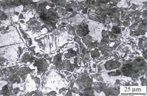 1 从组织形态上区分 铁素体和残余奥氏体共同存在于显微组织中,一般是亚共析钢淬火件。亚共析钢淬火件中存在的铁素体大致有三种形态:多角状未溶铁素体、块状先共析铁素体和网状或半网状先共析铁素体,颜色都较白亮。多角状和块状铁素体具有明显的边界,往往存在于马氏体针叶夹角的空白区域内,微调聚焦会发现白色相与马氏体相在同一个平面上。网状或半网状铁素体沿原奥氏体晶界分布,比较细。 残余奥氏体没有明显的边界线,其形状随马氏体针叶分布的形状而变化。亚共析钢淬火组织中的残余奥氏体一般不是单独存在,而是与淬后针状马氏体有机结合,所以颜色比铁素体稍暗,常能隐约看到针状马氏体浮凸的现象。 2 从热处理工艺上推断 如果亚共析钢淬火加热保温时间不足或温度偏低,会使淬火组织中出现白色多角状未溶铁素体。 图1 白色多角状未溶铁素体 如图1所示是45钢760℃加热保温25min水淬后的显微组织形貌,为白色多角状未溶铁素体+黑色中碳淬火马氏体+浅灰色马氏体+残余奥氏体基体。 如果炉内工件较多,出炉时间过长,工件在炉内的冷却速率大于退火的炉冷速率而又小于正火的空冷速率,或出炉后工件在空中停留时间过长,会使淬火组织中出现块状先共析铁素体。 图2 白色块状先共析铁素体 如图2所示是45钢840℃加热保温25min水淬,然后600℃保温60min回火后的显微组织形貌,其中的白色块状组织即先共析铁素体,其余是回火索氏体。 这是试验时,由于加热炉内所装工件较多,淬火时未按要求逐个进行操作并随时关闭炉门;而是在开启炉门第一个试样淬火后,一直到最后一个试样淬火结束,炉门一直是开启的。所以造成淬火后期,约有一半的淬火试样中出现了块状先共析铁素体。块状先共析铁素体的数量随着淬火时间的延长也由少到多,最后一个淬火试样中的块状先共析铁素体含量高达40%(体积分数)左右。由于炉门未关闭,当炉内工件温度降低到Ac3以下时,因炉内工件的冷却速率大于随冷却(相当于退火)而小于空气冷却(相当于正火),所以就析出块状先共析铁素体。 如果淬火冷却速率不够,钢中先共析铁素体一般呈网状或半网状沿原奥氏体晶界分布。 图3 白色网状先共析铁素体 如图3所示是45钢900℃加热保温25min油淬后的显微组织形貌,为白色细网状先共析铁素体+黑色淬火屈氏体+羽毛状上贝氏体+浅灰色马氏体+残余奥氏体基体。 只有淬火加热严重过热时,在淬火组织中可以观察到和马氏体不在同一个平面上的残余奥氏体,正常淬火组织中残余奥氏体并不明显。 图4 白色残余奥氏体 如图4所示是45钢900℃加热保温25min水淬后的显微组织形貌,为黑色淬火中碳马氏体+白色残余奥氏体,其中残余奥氏体形态随马氏体交角的不同而不同。