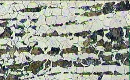 带状组织是钢材内部缺陷之一,出现在热轧低碳结构钢显微组织中,沿轧制方向平行排列、成层状分布、形同条带的铁素体晶粒与珠光体晶粒。这是由于钢材在热轧后的冷却过程中发生相变时铁素体优先在由枝晶偏析和非金属夹杂延伸而成的条带中形成,导致铁素体形成条带,铁素体条带之间为珠光体,两者相间成层分布。