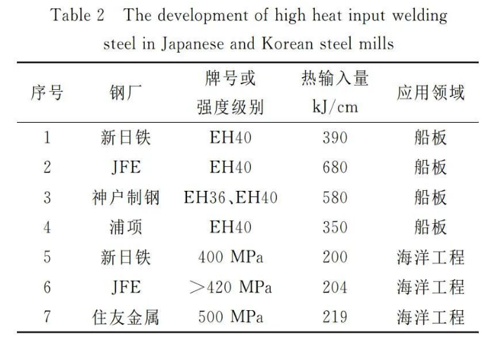 自20世纪70年代以来,日本和韩国几家钢铁企业分别成功开发了适用于大热输入焊接用钢,其中在船板和海洋工程用钢方面取得了显著进展,见表2。船板用钢的热输入量可达到350~680kj/cm,而海洋工程用钢的热输入量则相对较低,约为200kj/cm。相比而言,我国对大热输入量焊接用钢的开发和 研 究 起 步 较 晚。目 前,鞍钢可生产热输入量为100kj/cm 的船板。