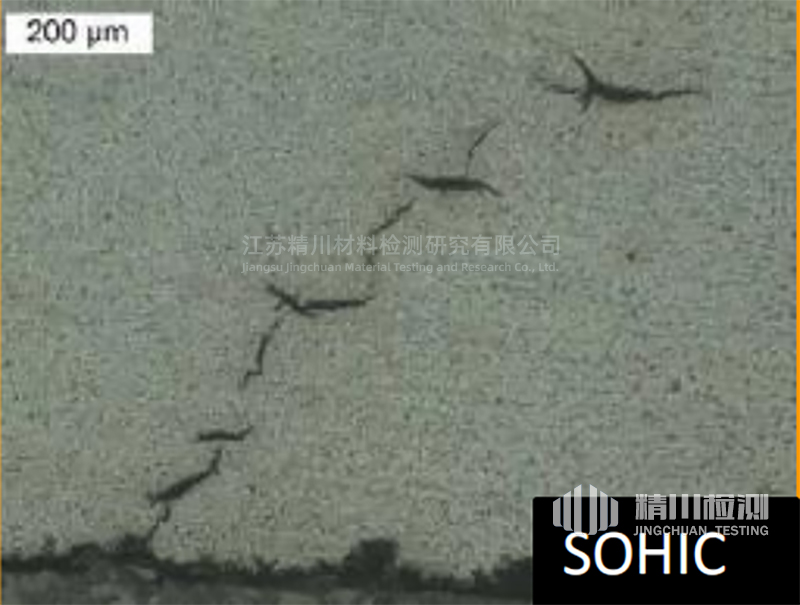 应力导向氢致开裂的裂纹与主应力(残余的或施加的)方向垂直呈阶梯状小裂纹,这种开裂可被归类为由外应力和氢致开裂周围的局部应变引起的硫应力开裂,应力导向氢致开裂与硫应力开裂和氢致开裂有关,它使已有的氢致开裂裂纹像梯子一样连接起来。在纵焊缝钢管的母材和压力容器焊缝的热影响区都观察到SOHIC。SOHIC并不是一种常见的现象,其通常与低强度铁素体钢管和压力容器用钢有关。