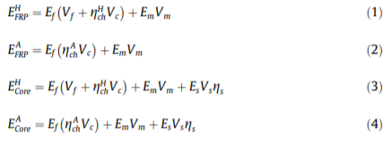 FRP层的剪切模量和泊松比是使用Halpin–Tsai和混合规则方程[21]计算的,核心层的剪切模量和泊松比采用Mori-Tanaka方法[22]获得。值得一提的是,FRP层和芯层的剪切模量值对分析结果的贡献很小,因为与法向应力分量相比,诱导剪切应力水平可忽略不计,本构材料的力学性能见表3。